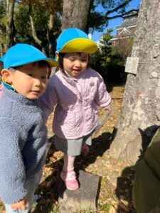 お城を見上げながら「大きいね!」「広島城の中に入ってみたい!」「上にのぼりたい!」とワクワク、興味津々で散歩の時間を楽しみました。